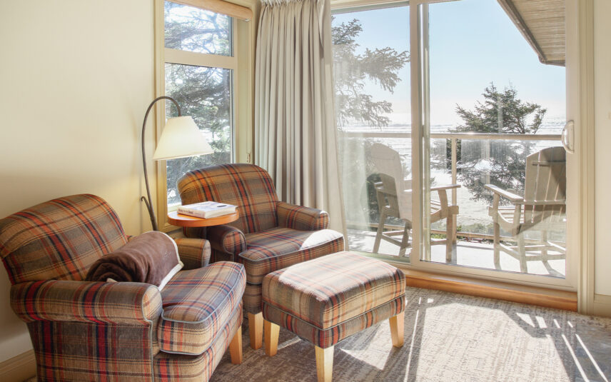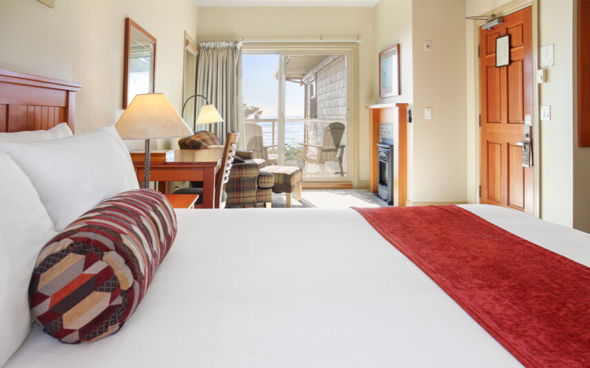 Our cozy Oceanview Rooms vary in view type, offering angled or partially framed glimpses of the rugged coastline through the trees – with extra windows for natural light and wildlife watching. Check out the waves from your private patio or unwind by the fireplace with a good book and a breathtaking sunset.